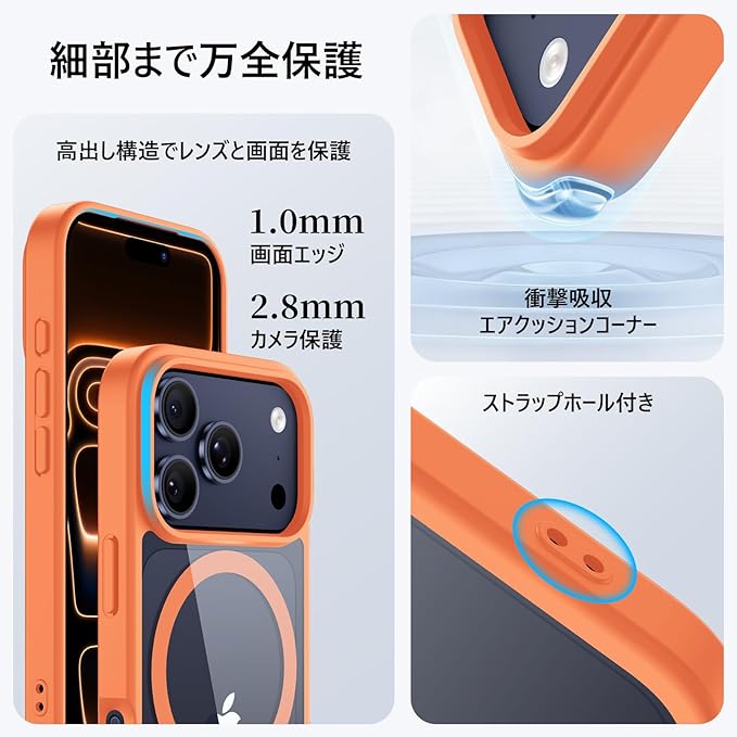 【万全の保護】iphone 17 pro max ケースの縁が1.5~2mm高く設計され、カメラレンズと液晶画面を完璧に保護します。便利で安全対策にもなるストラップホールにお好みのアクセサリーを取り付けることで、幅広い携帯性が味わえます。