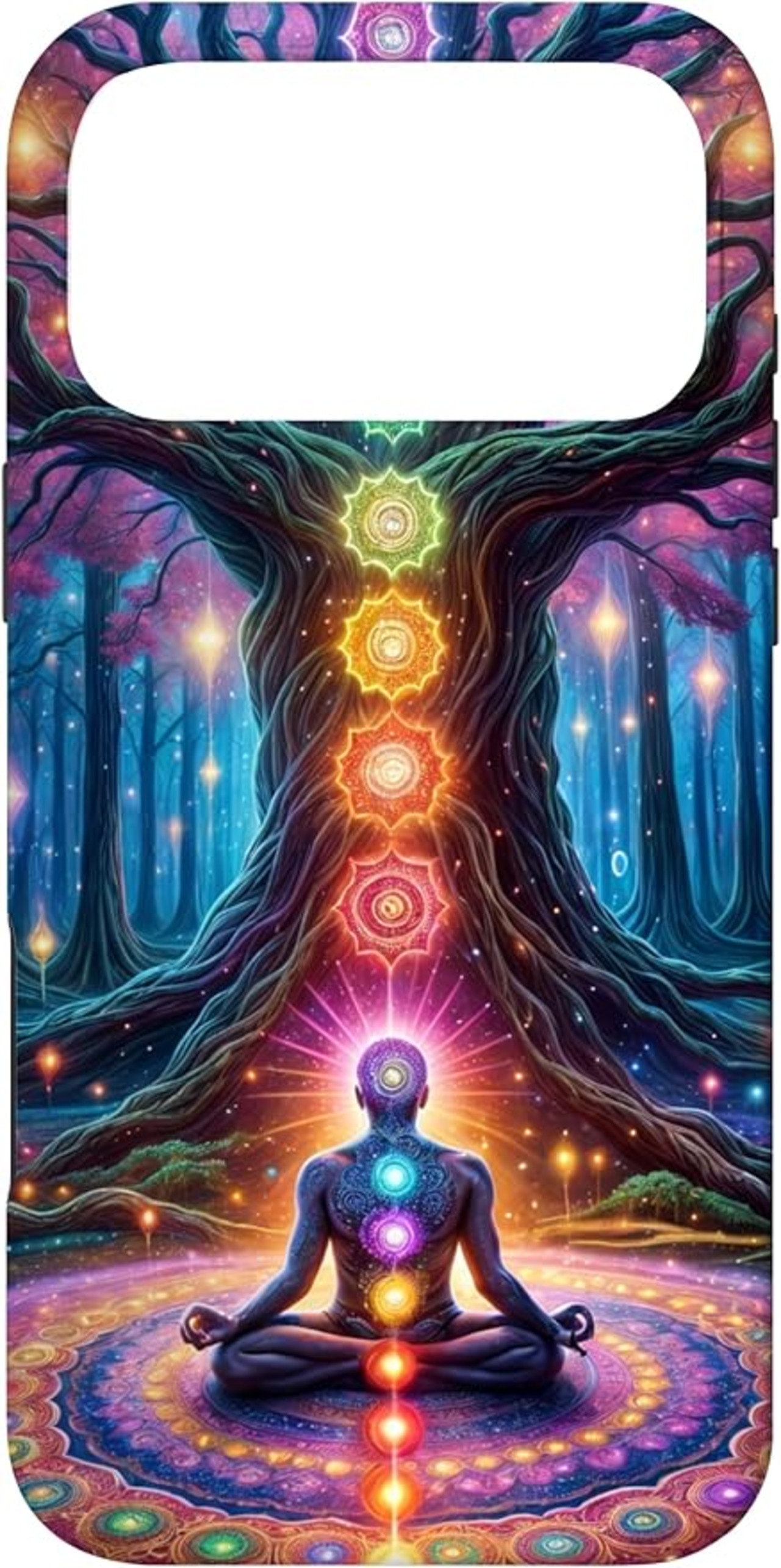 チャクラ瞑想ツリーネイチャーユニバース」は、自然、宇宙、スピリチュアルエネルギーセンターの要素が絡み合う、穏やかで深遠なデザインです。