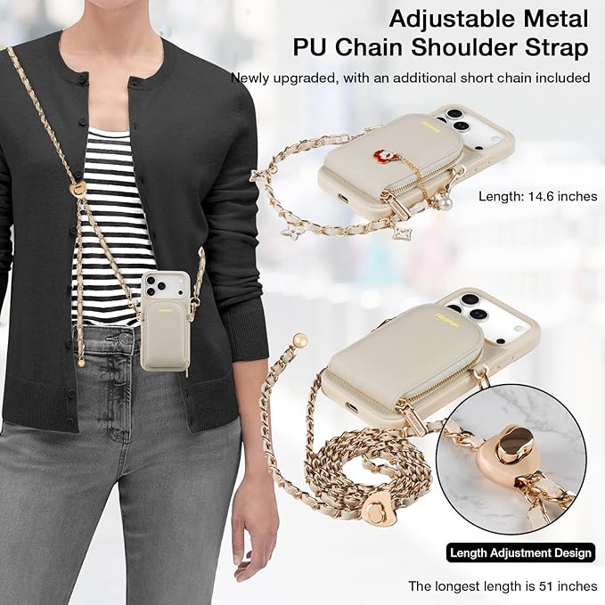 取り外し可能なクロスボディバッグ:Hanmanクロスボディジッパーウォレットケースの取り外し可能なショルダーストラップ と互換性のあるiPhone 17 Pro Max。スタイリッシュでエレガントなチェーンは、あなたのスマホケースをよりファッショナブルに演出し、外出時の美しい装飾としても活躍します。取り外し可能なブレスレットも付属しており、スマホケースをより個性的に演出します
