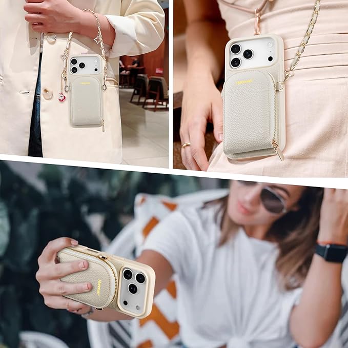 Hanman クロスボディウォレットケース と互換性のあるiPhone 17 Pro Max,取り外し可能なストラップとブレスレット付き,札入れ2つ、カードスロット4つ付き-ベージュ