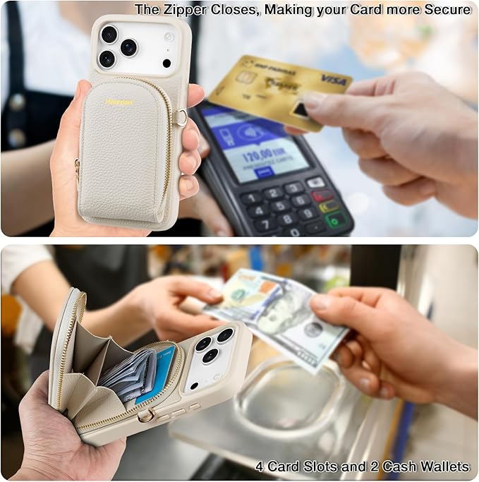 大容量ウォレットケース:Hanman クロスボディスマホケース と互換性のあるiPhone 17 Pro Max。4つのカードスロットと2つのキャッシュポケットを備え、小額現金、IDカード、デビットカード、運転免許証など、様々なカードを収納できます。さらに、スムーズなジッパー開閉で、持ち物を安全に守ります