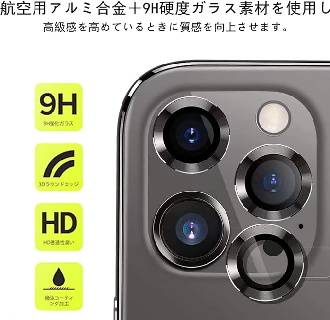 【高硬度・貼り付け補助ツール付き】航空用アルミ合金+9H硬度ガラス素材を使用し、高級感を高めているときに質感を向上させます。落下防止、キズ防止、防塵、防汚。ナイフや鍵などの尖ったものでも簡単には傷がつきません。貼り付け補助ツールが付きます。3枚のレンズ保護フィルムは貼り付け補助ツールに搭載されており。