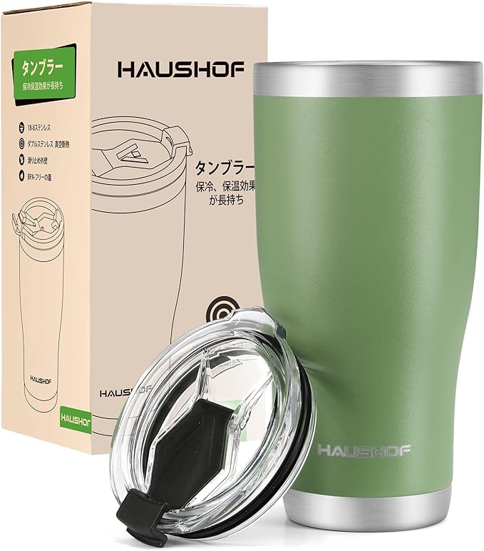 HAUSHOF 真空断熱タンブラー ステンレス ふた付き 600ml 車用タンブラー コーヒーカップ 水筒 マグボトル ステンレスコップ コンビニマグ 保温保冷 車載用 アウトドア用 釣り 遠足登山 キャンプ バーベキュー 【オリーブグリーン】
