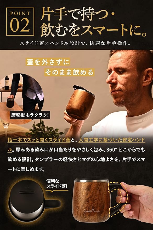 【ワンタッチで開閉できるスライド蓋】付属の蓋は指一本でスッと開くユニークなスライド機構を採用。シリコン製Oリングが隙間をふさぎ、移動中の揺れでもこぼれにくい安心構造です(密閉容器ではありません)。飲み口は360 どこからでも口当たりが滑らか。分解して食洗機で丸洗いでき、清潔さを保ちたい忙しい方にもぴったり。蓋付き マグカップは書類の多いデスクやPC周りでこそ真価を発揮し、テレワークの相棒として大活躍。おしゃれなカラーバリエーションは男女問わず選びやすく、父の日や誕生日プレゼントのサプライズにも映える実用ギフトです。