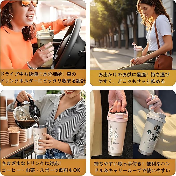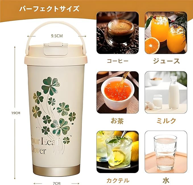 【医療用316ステンレス製】MYEEDA タンブラー ストロー付きタンブラー 蓋付き こぼれない ステンレス 真空断熱 コーヒー タンブラー 500ml 魔法瓶 大容量 おしゃれ 保冷 長時間 タンブラー 手を入れて洗える水筒 持ち運び コンビニコーヒー 広口 車 ドリンクホルダー対応 取っ手付き キャリー coffee mug(ホワイト・クローバー)