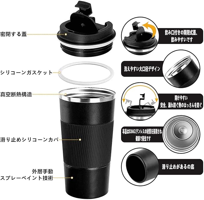 蓋の設計:蓋にある飲み口は唇に合う、フリップが固定できて、飲む時、鼻に打かなくて、飲み心地も良いです。飲み口も小さめなので、運転の時使っても安全です。