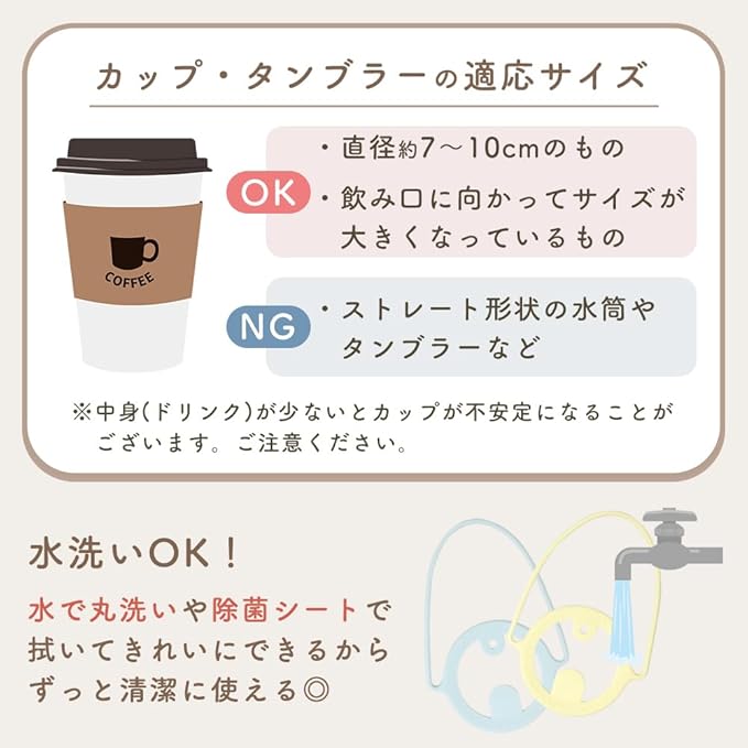 多用途ドリンクホルダー:ベビーカーなどに取り付けて使えるコップホルダー。テイクアウトやコンビニコーヒー、アウトドアやスポーツ観戦に最適。