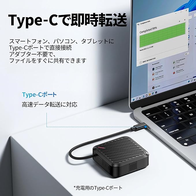 【Type-Cによる即時転送】Type-Cポート経由でスマートフォン、パソコン、タブレットに直接接続し、 ファイルを瞬時に共有できます。