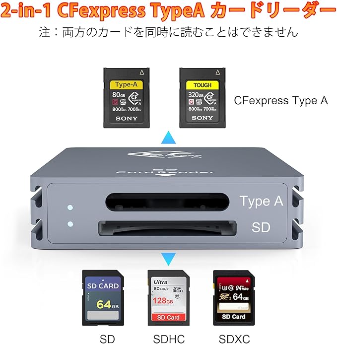 ✅【SDカードにも対応】このcfexpress typea カードリーダーはCFexpress Type Aカードだけでなく、SD/SDHC/SDXC/UHS-Iカードにも対応。複数のメディアを1台で扱えるため、写真家やビデオグラファーにとって非常に便利です。プラグアンドプレイ設計でドライバ不要、ホットスワップ機能によりカードの入れ替えもスムーズ。外出先でも快適にご利用いただけます。