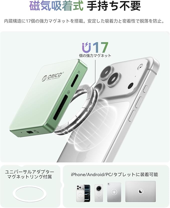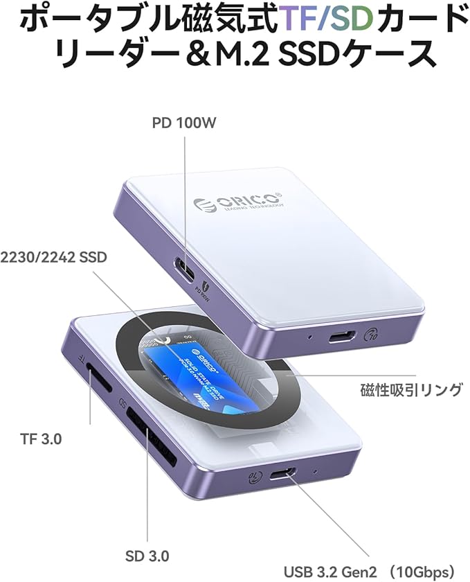 ORICO 5 in 1 磁気吸着式カードリーダー & M.2 ハードディスクケース TF/SD 3.0、M.2 NVMe 2230/2242 SSDインターフェース搭載、USB 3.2 Gen2 10Gbps高速転送、TF-SD 3.0の読み書き速度は最大104MB/s、 PD 100W高出力充電対応マグネット式カードリーダー/M.2 ケース、SSDを含まない -AP42F (グリーン)