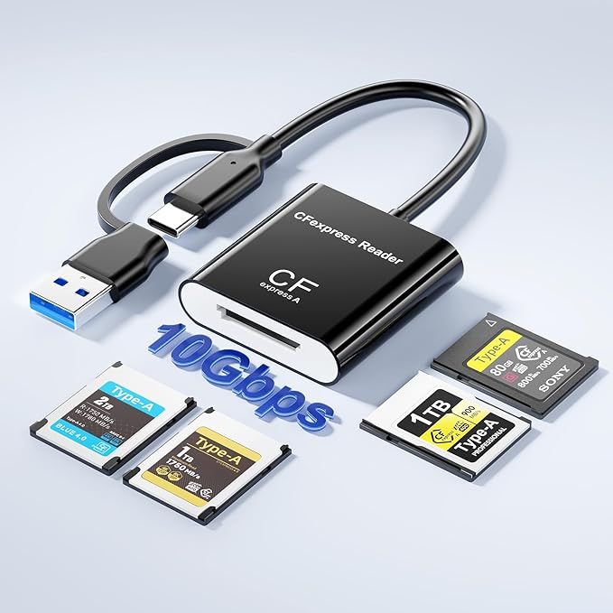 【2in1 CFexpress type a カードリーダー】写真撮影愛好家必携の高速データ転送アイテムこの CFexpress Type-A専用カードリーダーは、Type-A 規格カードに完全対応したスロットを搭載。一眼レフやミラーレスカメラで撮った高画質写真・動画のデータ読み取り・転送に最適です!さらにUSB-C/USB-A の 2 イン 1 デザインを採用し、パソコンやタブレットのポートタイプを問わず接続可能。撮影現場から自宅のデスクまで、手軽にデータを整理できるので、写真愛好家には欠かせない便利アイテムです。