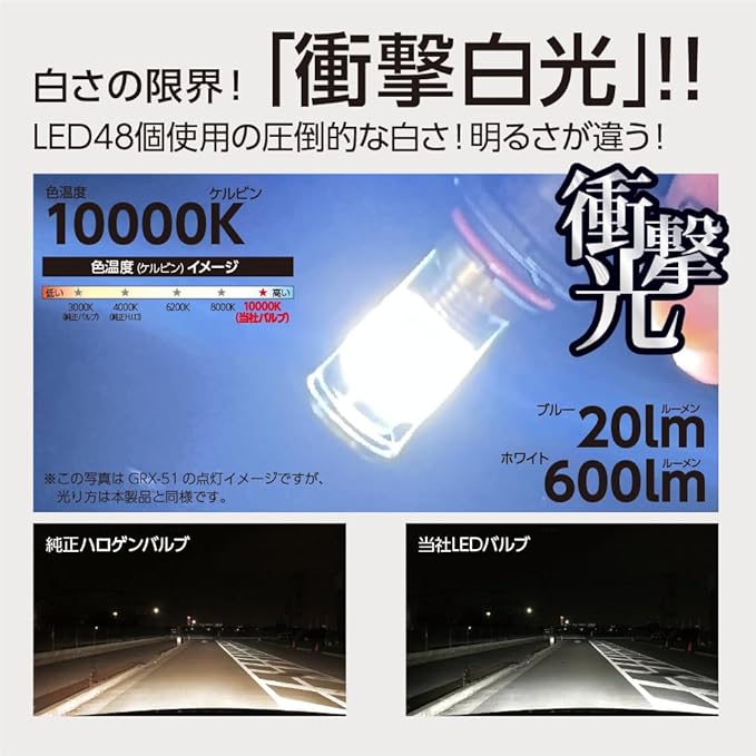仕様(12V車専用) ・電源:DC12V車専用 ・ホワイト光:600ルーメン(10000K) ・ブルー光:20ルーメン ・カラー:クールホワイト/ブルー ・形状:H8/H11/H16共通(GRX-51)、HB4専用(GRX-52)