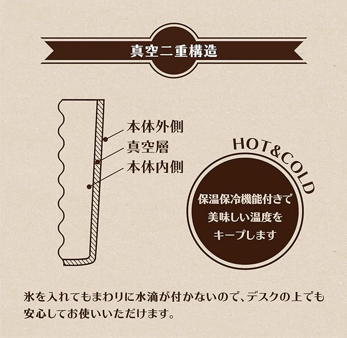 真空二重構造になっているので冷たいものをいれても周りに水滴が付かず机を汚しません。美味しい温度をキープします。