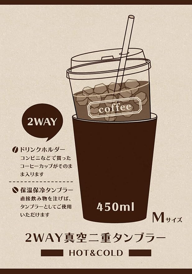 直接飲み物を注いでも、コンビニやコーヒーショップ、ファーストフード店の紙やプラスチック製のカップをそのまま入れても、ぴったりのサイズの2WAY仕様。