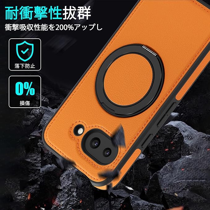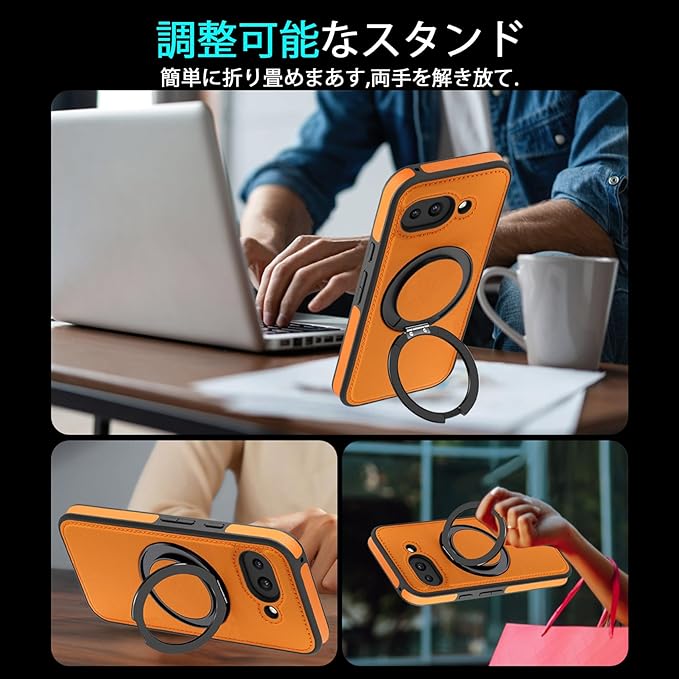 Google Pixel 9A 用ケース Magnetic対応 リング付き 耐衝撃 レンズ保護 グーグル ピクセル 9a 用ケース マグネット搭載 360 回転 PC+PUレザー 衝撃吸収 スタンド機能 黄変防止 シンプル スマホカバー オレンジ J15-04