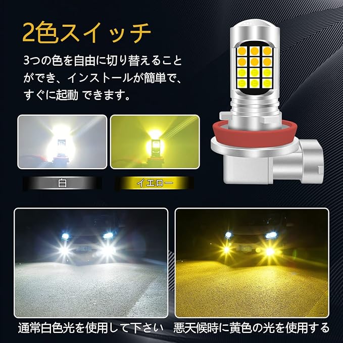 chemini(チェミニ) H8 H11 LED フォグランプ 2色切り替え 爆光 12V ホワイト6000K/イエロー 3000K 高輝度 3030 LEDチップ 360 光源 車用 H16 IP67防水 車検対応 無極性 一体型 取付簡単 2個セット