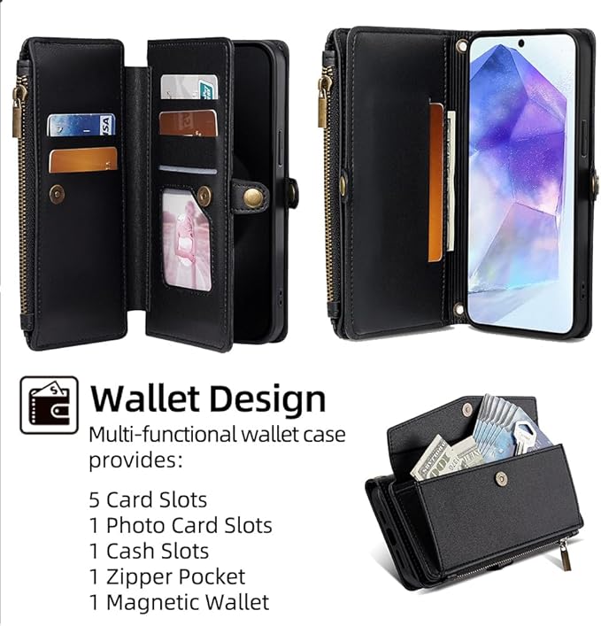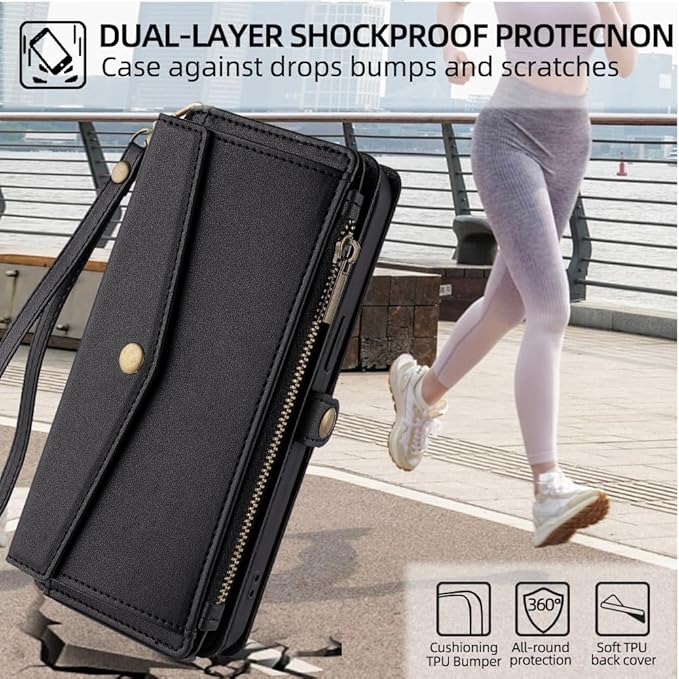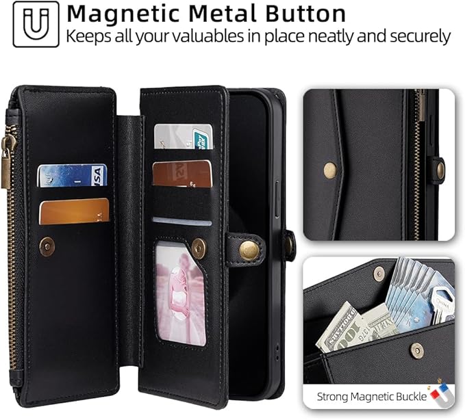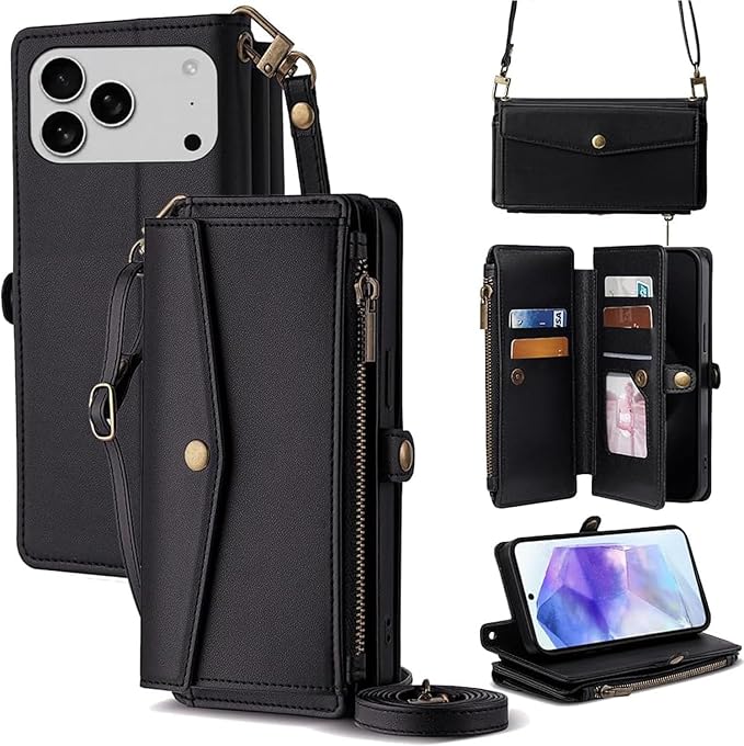 for iPhone 17 Pro Max ケース 財布型 for iPhone 17プロ マックス 手帳型 ショルダー ストラップ長+短2本 5枚カード収納 1枚の写真収納スタンド機能 1枚の現金収納 1つのジッパーポケット 防落・防コケ・防ひび PUレザー プレゼント COCOCLOUD ブラック01