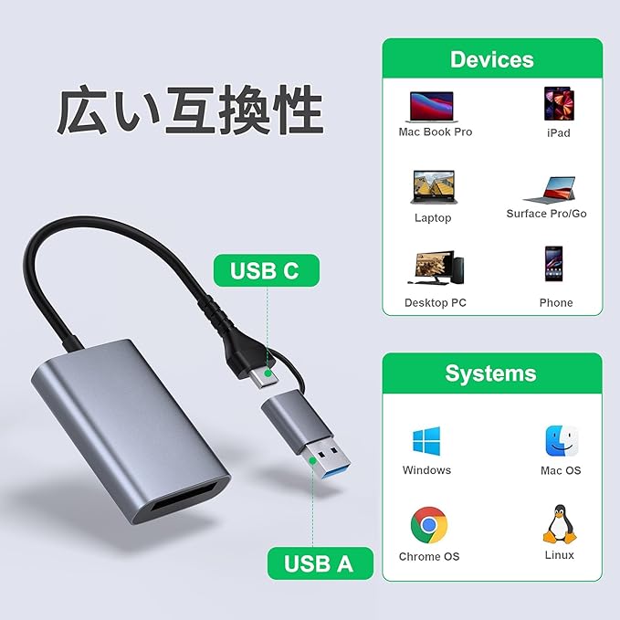 CFexpress Type-Aカードアダプタの10Gbps高速転送 : CFepxpress Type-Aカードリーダーは、CFexpressカードのUSB3.2 Gen2 (10Gbps)超高速データ転送をサポートしています。10Gbpsの高速データ転送を実現するには、お使いのデバイスのUSB/USB CポートがUSB3.2 GEN2の速度に達している必要があります。注:最終的なデータ転送速度は、カードとUSBスロットのタイプによって決まります。