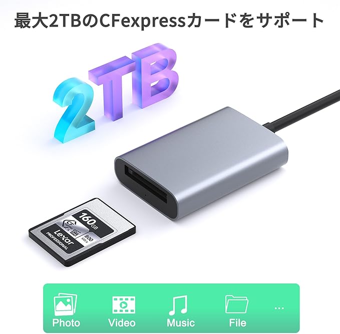 プロフェッショナルCFexpressタイプAカードリーダー: このカードリーダーは、CFexpress(タイプA)メモリカード用に特別に設計されています。写真やビデオ撮影を愛し、CFexpressカードを使用する人々に大きな利便性を提供します。特に、プロブロガー、インフルエンサー、写真家、映像作家、ビデオグラファーに最適です。