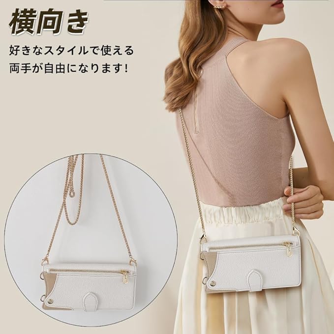 快適な持ち心地と使いやすさ: 付属クロスボディチェーン、全長120 cm。金具の装飾が美しさと上品さを漂わせてます。斜めがけ、肩掛け、通勤、旅行、犬の散歩、山登り、海へ行く、買い物、外食、重い荷物を持っている時、子供を連れて外出する時もスマホを紛失すること心配なく両手が解放されます。また、マグネット式の留め具により、片手で簡単に開閉ができ、スタンド機能も兼ね備えています。