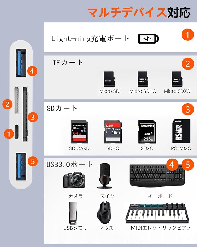 【5in3・SDカードリーダー】カードリーダーの3本のケーブル(Ligtn-ing/Type-C/USBケーブル)は、あらゆる携帯電話/Pad/Android/PCデバイスで使用できる。SDカードポート(SD / SDHC / SDXC / RS-MMC / MMC- Microカード)+TFカードポート(Micro SD / Micro SDHC / Micro SDXCカード)+Phone充電ポーinト+USB 3.0ポート*2。