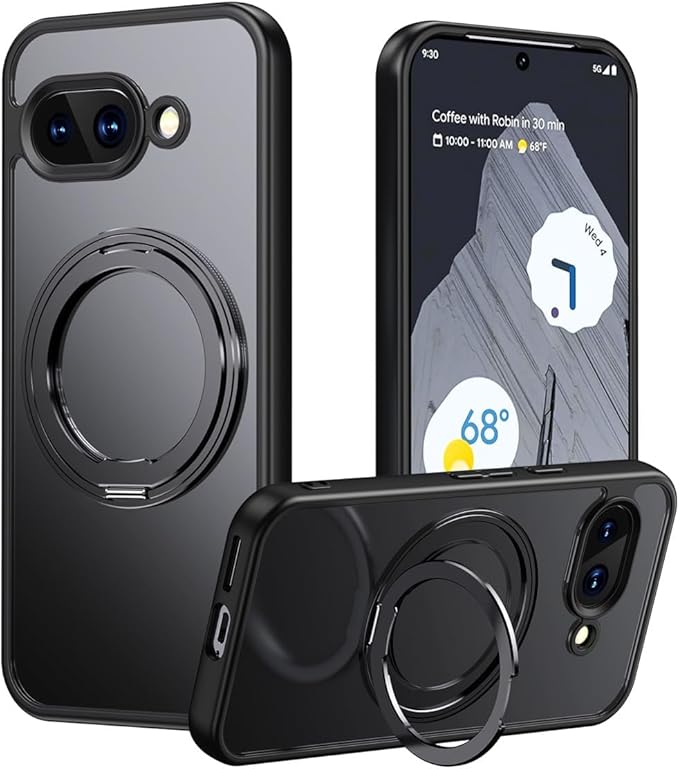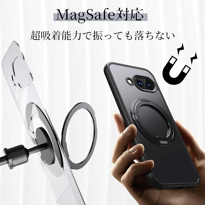 Google Pixel 9a用 ケース MagSafe対応 リング付き 360 回転スタンド 半透明マット 耐衝撃 カメラ保護 ワイヤレス充電対応 指紋防止 黄ばみ防止 ストラップホール付 グーグルピクセル9a カバー (ブラック)