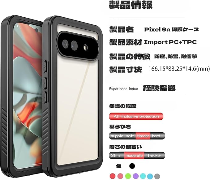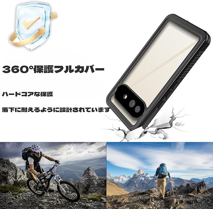 【強防衝撃力&360 保護】 軍用MIL規格810G-616防振材料が採用されていますので、衝撃にとても強いです。Pixel 9a 防水ケースの嵌め込み式前カバーと透明バックカバーの組み合わせにより、360 全方位からPixel 9a を保護してくれます。落下、衝撃、擦れ傷など一切心配ありません。粉塵も中に入らない、砂や埃が舞う過酷な環境でも端末をしっかり包んで保護します