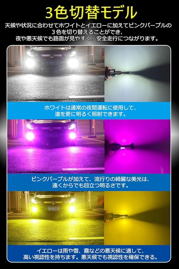 3色発光切替式:純正交換だけでカラフルチェンジ!個性のあるフォグランプに変装のは超簡単。3色の発光、天候に合わせて色温度が切替えできます。普段はホワイトでかっこよく、雨や雪なとの悪天候はイエローで視認性バツグン、気分転換時はスペシャルなピンクパープル。フォグランプのON/OFFだけで色を切り替えます。色切り替え順番:ホワイト→イエロー→ピンクパープル。