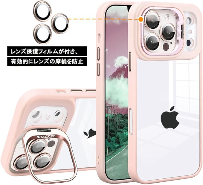 スマホケース 対応 iPhone 17 Pro Max クリアケース 透明 レンズスタンド付き スタンド機能 レンズカバー付き PC背面+TPUバンパー おしゃれ 耐衝撃 ストラップホール付き アイフォン17プロマックス携帯電話ケース (ピンク, 17 Pro Max)