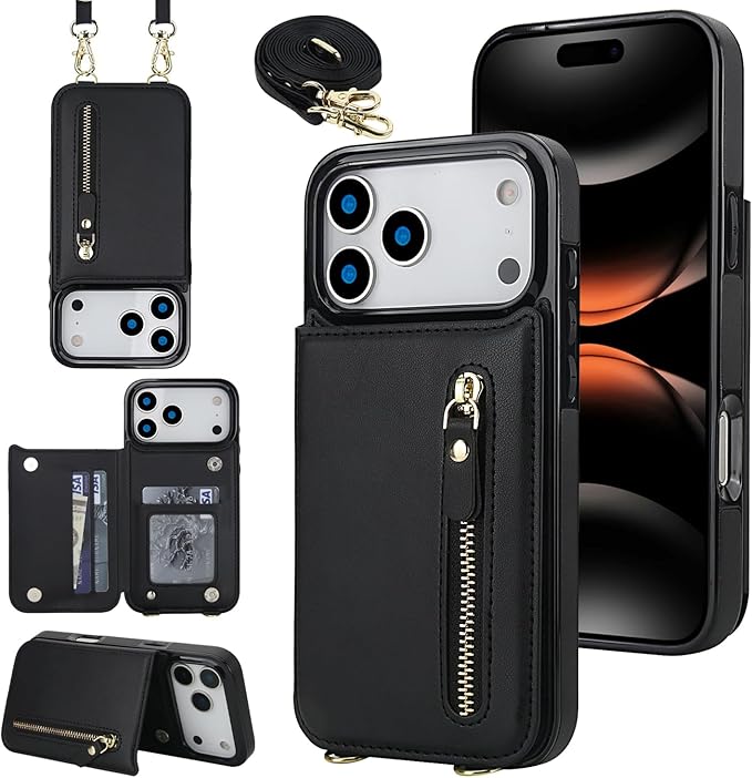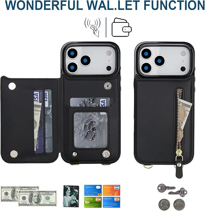 BonwFzin 適用 IPhone 17 Pro MAX ケース ショルダー ストラップ 背面 フリップ 紐付き アイホン 17プロマックス スマホケース 手帳 アイフォン 17プロマックスケース RFID防止 肩がけ 首掛け 斜め掛け 小銭入れ ファスナー型 ストラップ付き スタンド カード入れ ブラック