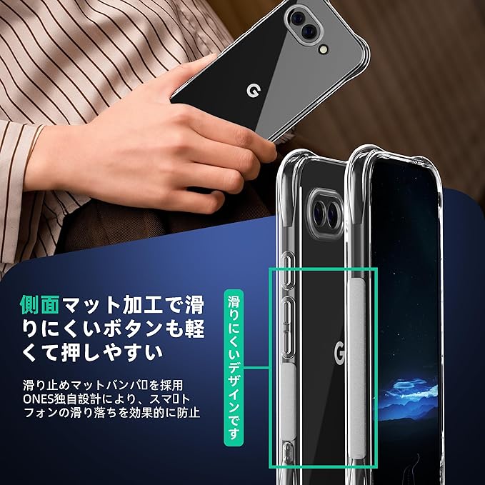 【米軍MIL規格準拠・衝撃吸収・四隅エアクッション】ONES独自のエアクッション技術を、上部・下部バンパーおよび四隅コーナーに採用します。米軍MIL規格(MIL-STD-810G)準拠の耐衝撃設計により、日常生活で起こりやすい落下や衝撃を効果的に吸収・分散します。柔らかくしなやかなTPU素材を使用したソフトケース仕様で、Google Pixel 9aを全方位からやさしく保護します。