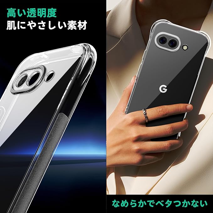 【高透明・柔軟フィット・指紋認証対応】明度が高く、本体の鮮やかな色をそのまま映し出すことができ、Google Pixel 9a のオリジナルのカラーを損ねません。ケースの端はダイヤモンドカットプロセスを施すことでより洗練された美しい外観となっています。ケースは、型どりを緻密に実施しており、 Google Pixel9a本体に完璧にフィットするとともに、持ったときの圧倒的なフィット感も実現しています。GooglePixel9aの美しさはそのままに、 Google Pixel 9aを保護しているのです。これはGoogle Pixel 9aの指紋認証を完全にサポートします。
