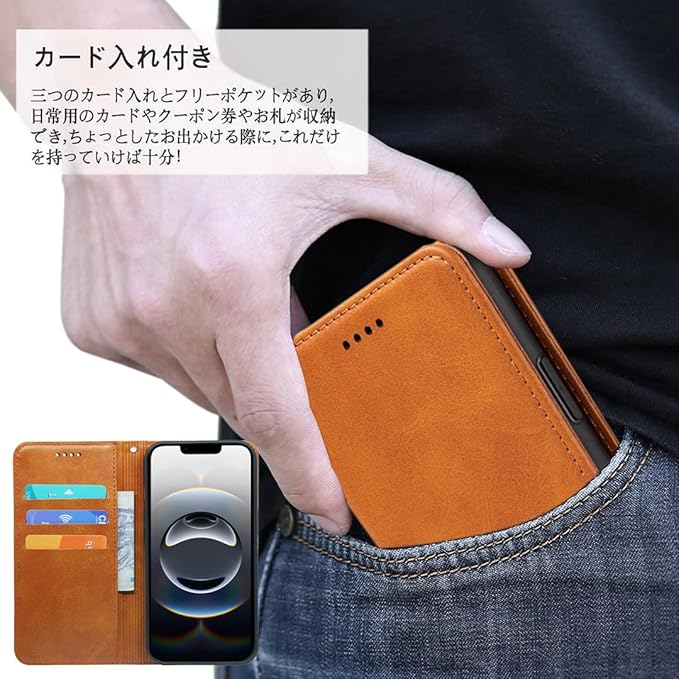 【ポイント②】:内蔵マグネット設計で、シンプルで洗練された外観。精密縫製技術で仕上げたレザーケース型保護カバー。