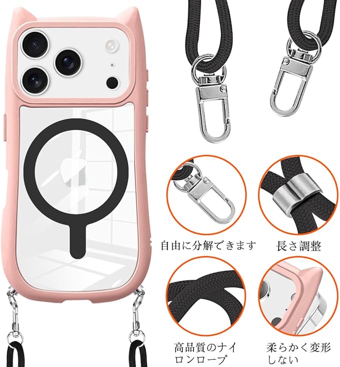 iPhone 17 Pro Max ケース MagSafe対応 猫耳 TPU ストラップ穴付き ショルダー 肩掛け 縄掛け 紐付き 斜めがけ ストラップ着脱可 いphone 17 pro max スマホケース 韓国 おしゃれ 可愛い クリア 指紋防止 耐衝撃 滑り止め 全面保護