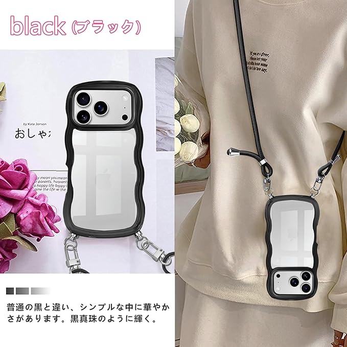 iPhone 17 Pro Max 用の ケース ショルダー クリア うねうね いphone17 pro max カバー スマホケース 創意 個性 肩掛け 首掛け 斜めかけケース 可愛い かわいい 韓国 透明 TPU 耐衝撃 アイフォン17promax(ブラック)