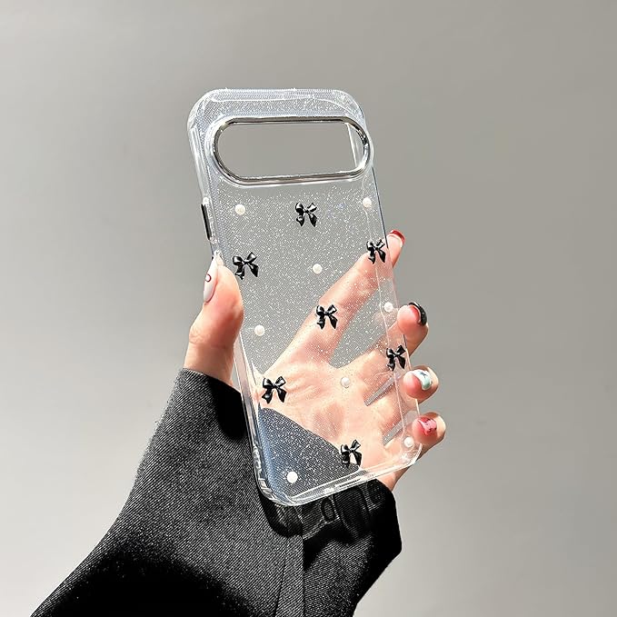 QLTYPRI Google Pixel 9a 用 ケース クリア ブラック ミニリボン おしゃれ 韓国 透明 可愛い 耐衝撃 スマホケース 立体 りぼん装飾 きらきら ピクセル 9A ケース 対応、ブラック