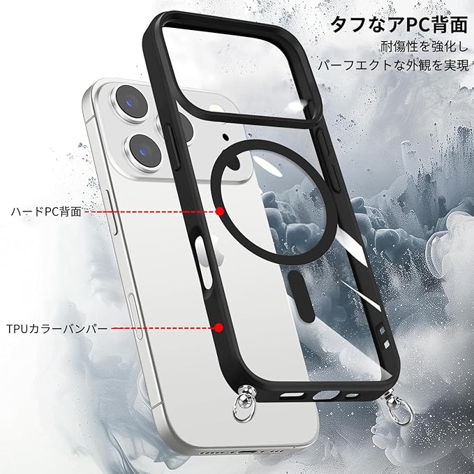 iPhone 17 Pro Max 用 ケース クリア ショルダー MagSafe対応 ワイヤレス充電 アクリル背面 耐衝撃 マグネット搭載 アイフォン17プロマックス ケース マグセーフ対応 耐久性 滑り止め 黄変防止(ブラック)