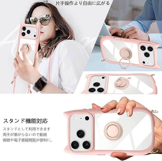 for iPhone 17 Pro Max 専用 ケース ショルダー クリア カバー リング付き 隠しスタンド 猫耳 ネコミミ 背面ガラス かわいい おしゃれ スタンド付き ストラップホール アイフォン17プロマックス スマホケース 多機能 全面保護 落下防止(ピンク)