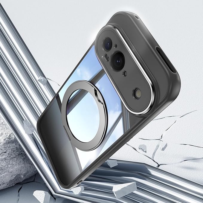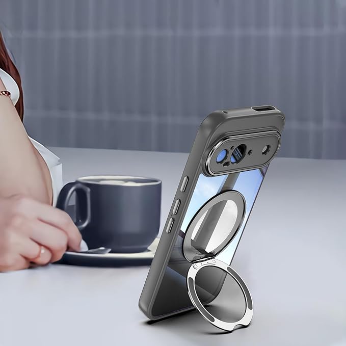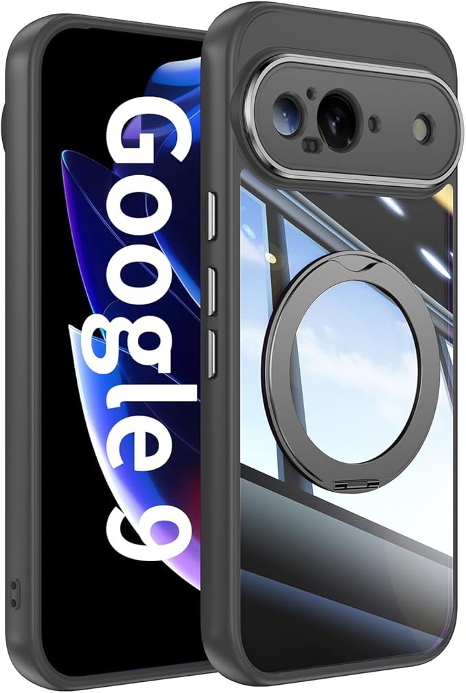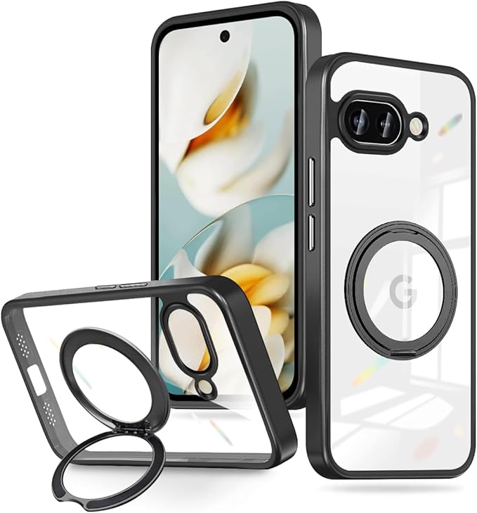 Google Pixel 9a 用ケース クリア リングマグネット搭載 360 回転 pixel 9a 用ケース 横縦両立 角度調整ピクセル9a 用 カバー 透明 PC 耐衝撃 多機能 マグネット搭載 高耐久性 薄型 軽量 黄変防止 落下保護 紛失防止(ブラック)