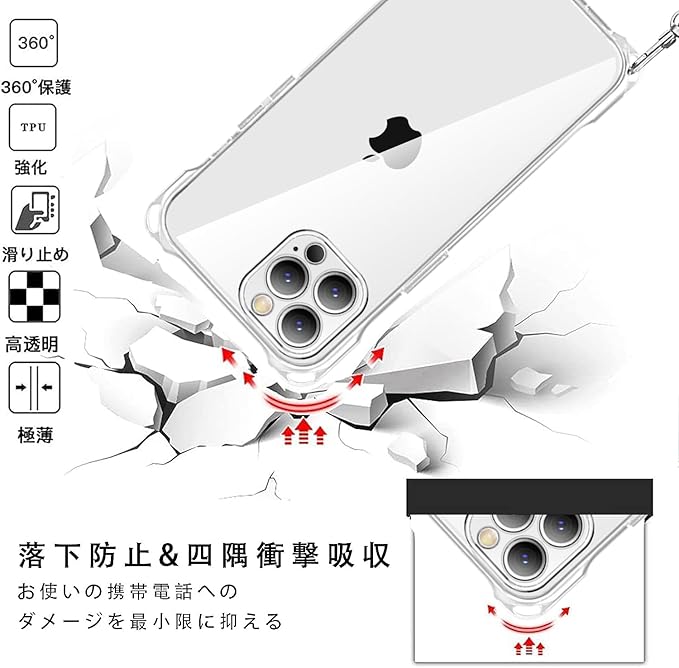 【高耐衝撃性・全面保護】カメラレンズの周りに段差をつけて擦り傷を防ぎます、平らな場所においても、液晶画面とカメラレンズに直接触れることがなく、ケース四隅のエアクッションデザインにより、ケースの四角を強化し、本体が落ちる場合に伝わる衝撃を吸収し、落下時の衝撃を最小限に抑えます、iPhoneを全方位からしっかり守れます。
