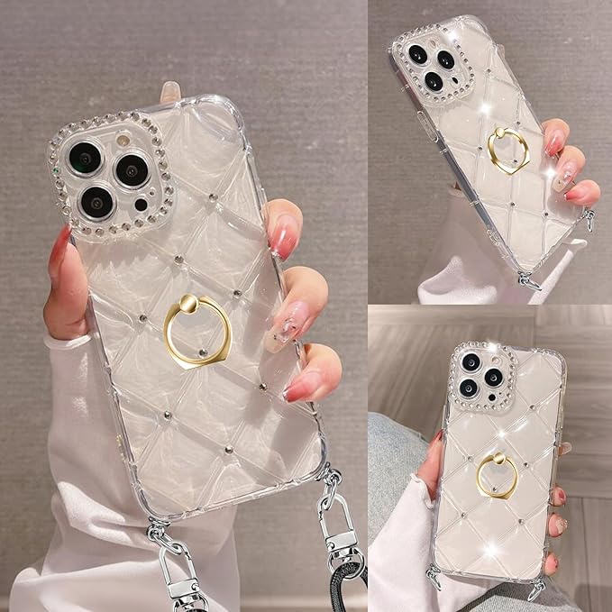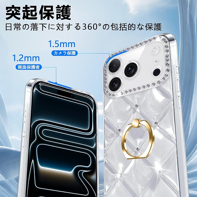 ケース iPhone 17 Pro Max クリア 用の 薄型 ひし形 ダイヤモンド ぴかぴか光る クリア いphone 17pro maxカバー 軽量 TPU ファッション アイフォン17 pro max スマホケース 首かけ 斜めがけ 調節可能 リング付き 360 回転 スタンド機能 耐衝撃 転倒防止 かんしょうほご 耐久性 黄変防止 ひっかき防止 レンズ保護スマホ (透明)
