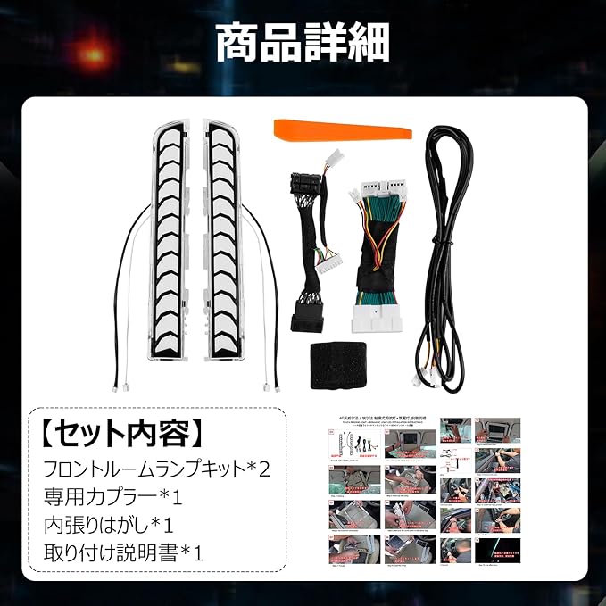1.【適合車種】:アルファード ヴェルファイア 40系。適合型式:AAHH AGH TAHA 40 45。適合年份:2023年6月~現行。※アルファード40系 Xグレードは装着不可です。※切り替えはエンジン始動時のみ可能です。※エンジンOFF時にドア開閉するとイルミネーションは15秒間の一時点灯状態になります。15秒以内にエンジンONするとイルミネーションは点灯状態が維持され、15秒後にエンジンONするとイルミネーションは消灯状態が維持されます。注意事項:製品画像とお車をご確認頂き、お買い求め下さい。【セット内容】:フロントルームランプキット*2+配線一式+内張りはがし*1
