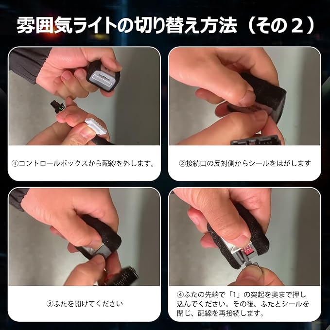 3.【9色雰囲気ライト】:両側に高級感あふれる9色雰囲気ライト照明を追加。車両本来の雰囲気灯色を完全再現し、車の高級感を損なわず、想像以上のドレスアップ効果をもたらしてくれます。※単色モード:エンジン始動後、〈COLOR〉ボタンを押すごとに、雰囲気ライトが切り替わります。※自動モード:①「ROOM」ボタンを押す→雰囲気ライトが点灯(最大輝度)②「ROOM」ボタンを3秒以上長押し→ライトが消灯③消灯後、3秒以内に再度「ROOM」ボタンを押す→自動モードに切り替わります。※自動モードにすると、5秒間隔で色が自動的に変わります※同様の操作で単色モードにも切り替え可能。※消灯方法:「ROOM」ボタンを長押し→ライトが消灯(OFF)。