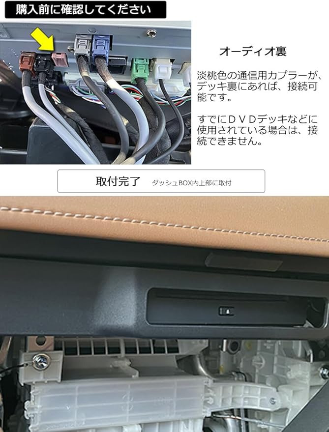 40系アルファードの、最上位グレード以外はDVDデッキのメーカーオプション設定がありませんが、この電源ハーネスを利用することで、後からメーカーオプション用DVDデッキ「86270-78010」を、車両側電源に接続することができます。