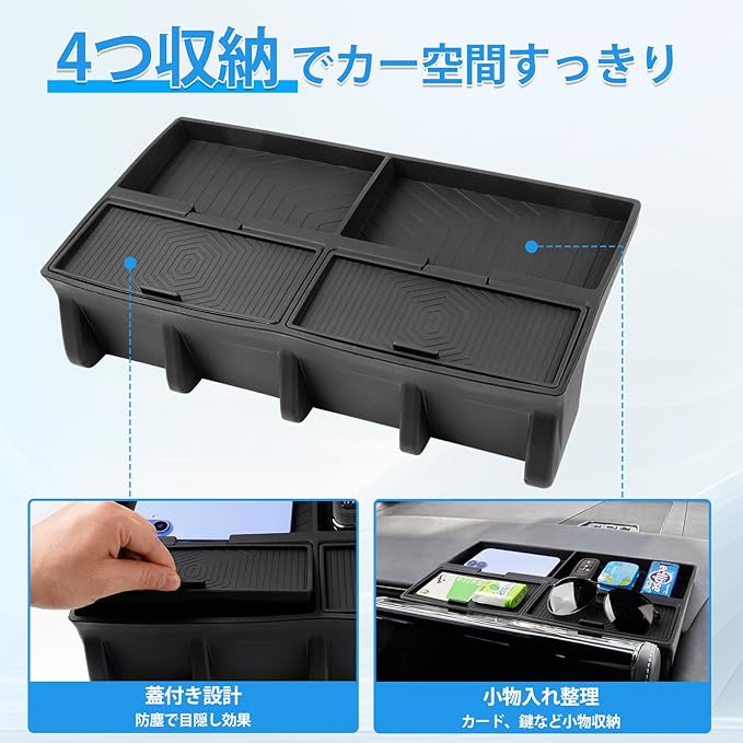 2.【スペース活用・蓋付き】車内小物をすっきり整理、仕切りでカード・サングラス等を分け収納。蓋付き設計でプライバシー漏れを防ぎ、日光直射を防ぐと同時に、運転中の視線を遮ることなく、ドライブ安全性を向上させます。