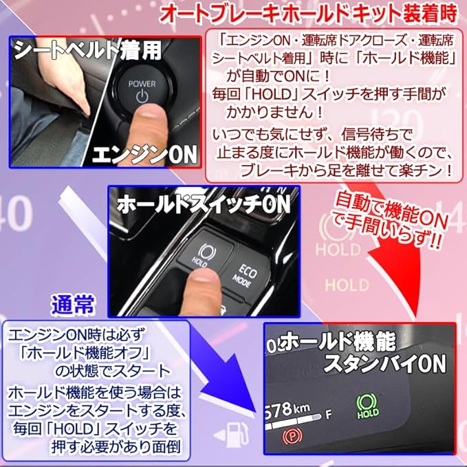 当製品を取り付けると、エンジンを掛けるたびに、毎回HOLDボタンを押さなくてもブレーキホールド機能が自動でっスタンバイ状態になります