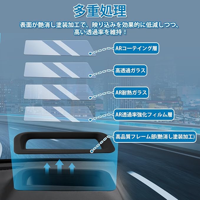 2.【二重像対策・高透過率】:本製品は特殊なARコーティング処理を施すことで光の屈折を最適化し、二重像を効果的に軽減。高い透過率を維持しながら、HUD表示を格段にクリアに映し出すことを実現しました。