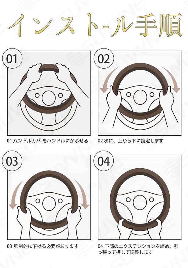 【簡単取り付け】特別な工具や専門知識は一切不要です。1.取り付けは、中央のロゴマークを合わせる 。2. ハンドル上部から被せていく 。3. 途中でセンター位置を調整しながら嵌め込む 。4. ステアリングの下側を引き上げながら、最後までしっかり押し込んで完成します。長期間のご使用にもご安心いただける耐久性で、安全かつ快適なドライブを実現します。