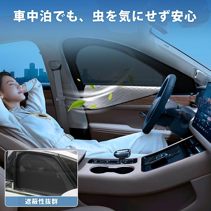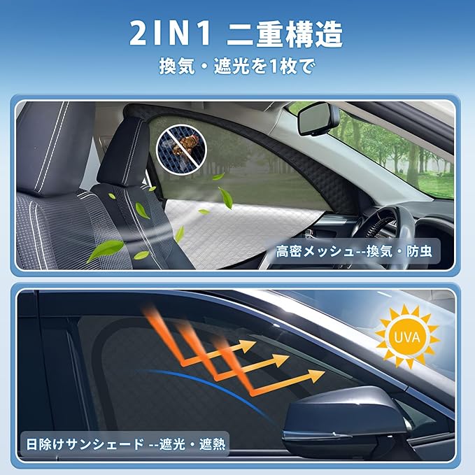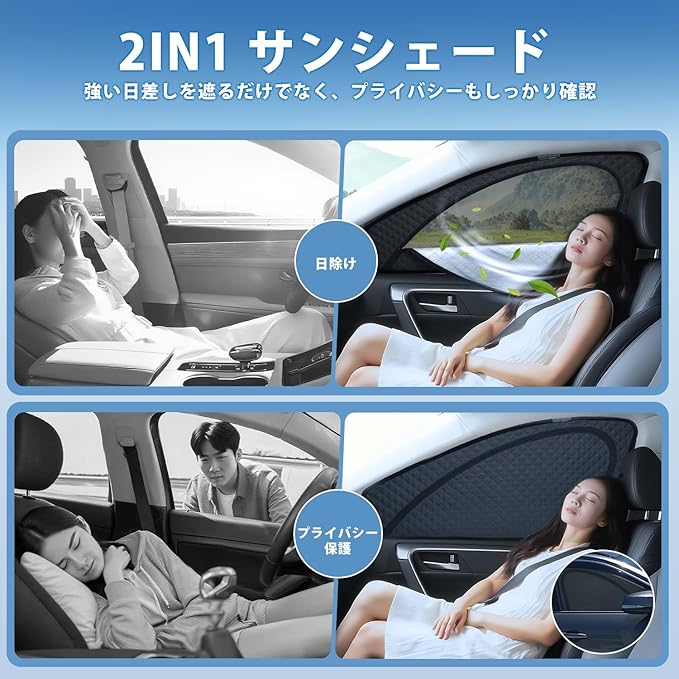 2.【2in1一体式・夏の暑さ・日差し対策に】:遮光と通風を両立した2in1一体式設計。 炎天下で長時間駐車する場合でも、直射日光をやわらかく遮り、車内温度の上昇を抑制します。 ファスナー開閉により、サンシェードとしてもメッシュカーテンとしても使い分け可能。 強い日差しを防ぎながら風を通すため、夏場の車内休憩や移動時の暑さ対策に最適です。