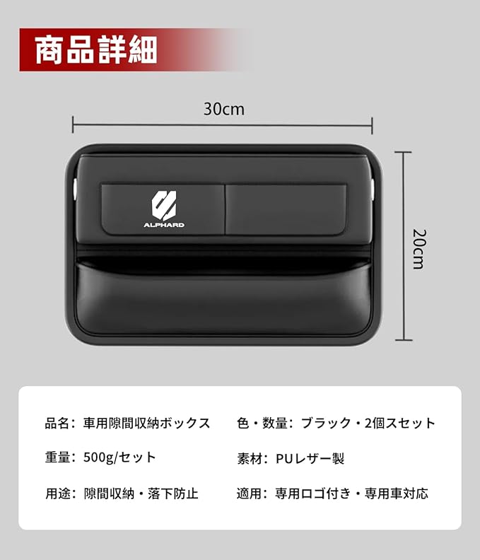 【アルファード 専用】隙間収納ボックス ALPHARD 専用ロゴ シートサイドポケット 車 アルファード 20系 30系 40系 対応 大容量 収納 小物入れ 落下防止 カー用品 車内 アクセサリー 便利グッズ PUレザー 運転席+助手席用 ロゴ左右方向対応 2個セット (ブラック, アルファード 専用)